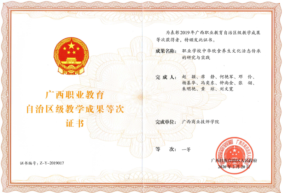 • 廣西職業院校技能大賽中餐熱菜 區級一等獎